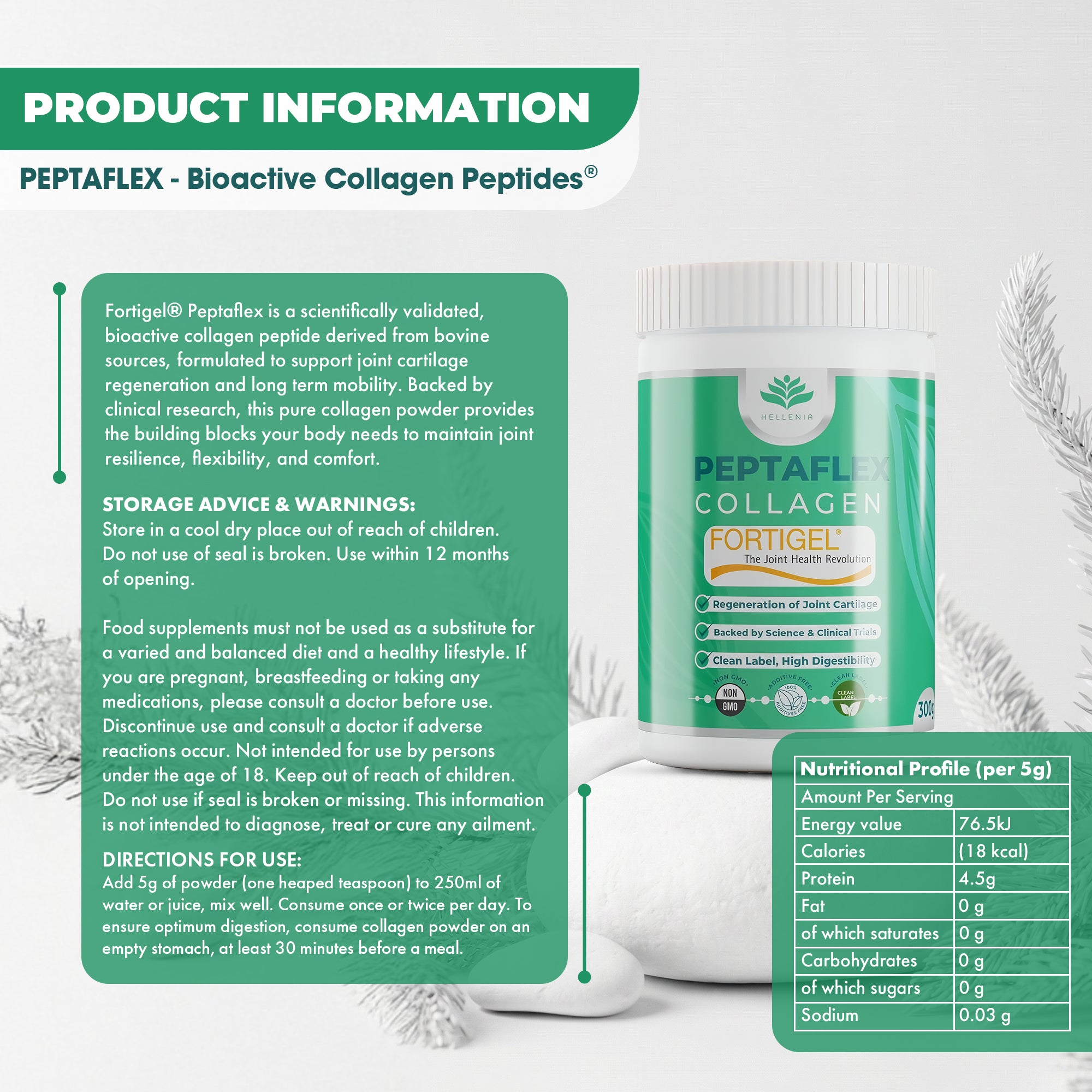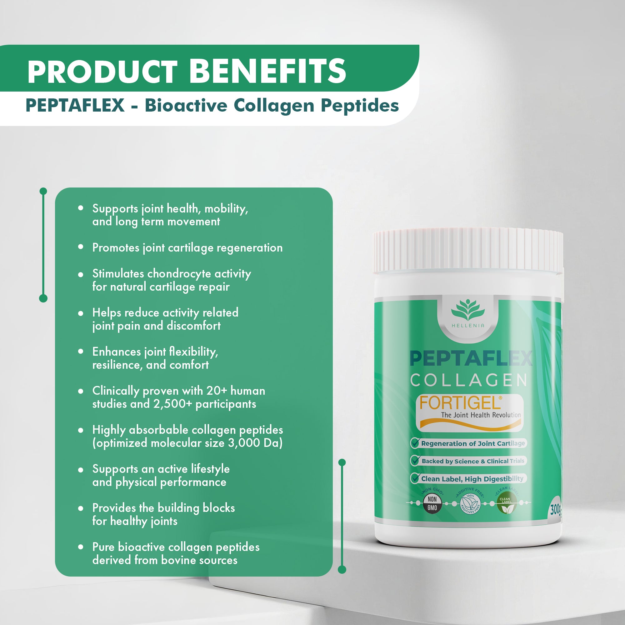 Fortigel® Peptaflex is a scientifically validated, bioactive collagen peptide derived from bovine sources, formulated to support joint cartilage regeneration and long term mobility. Backed by clinical research, this pure collagen powder provides the building blocks your body needs to maintain joint resilience, flexibility, and comfort.