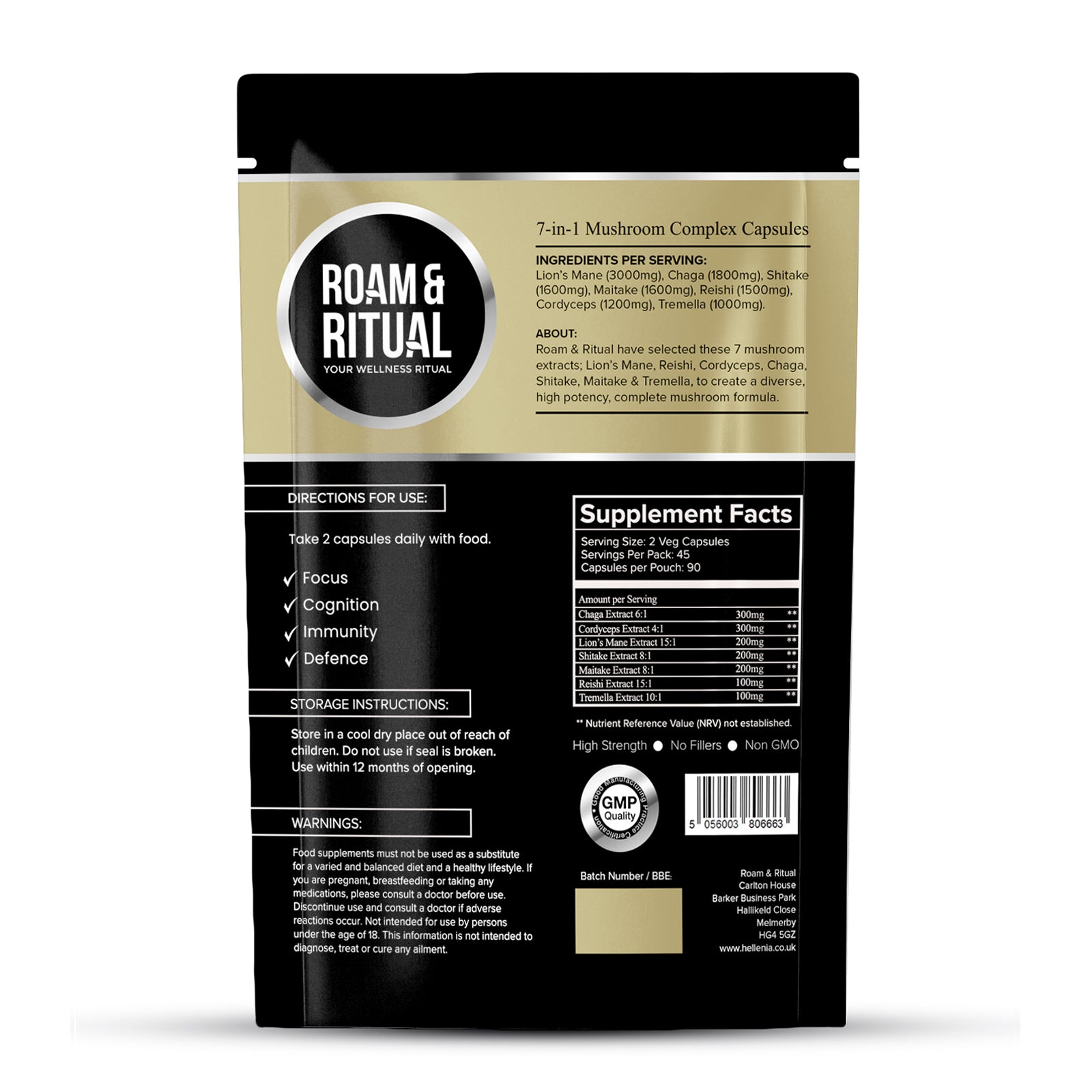 Unlock the power of seven of the world’s most respected functional mushrooms in one high-strength, expertly formulated supplement. Roam & Ritual’s 7-in-1 Mushroom Complex Capsules combine Lion’s Mane, Reishi, Cordyceps, Chaga, Shiitake, Maitake, and Tremella to support your mind, body, and overall wellbeing—naturally.