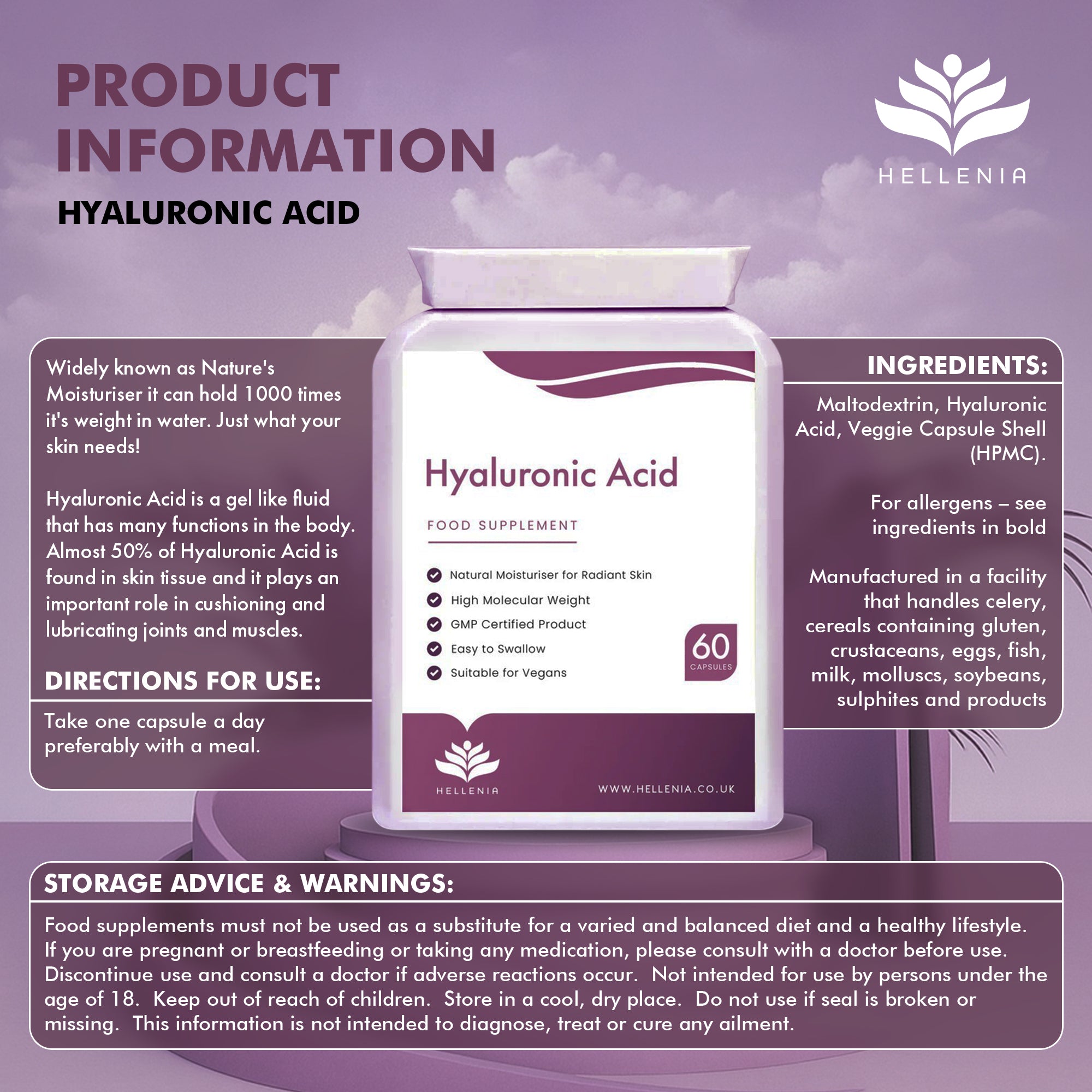 Maltodextrin, Hyaluronic Acid, Veggie Capsule Shell (HPMC).