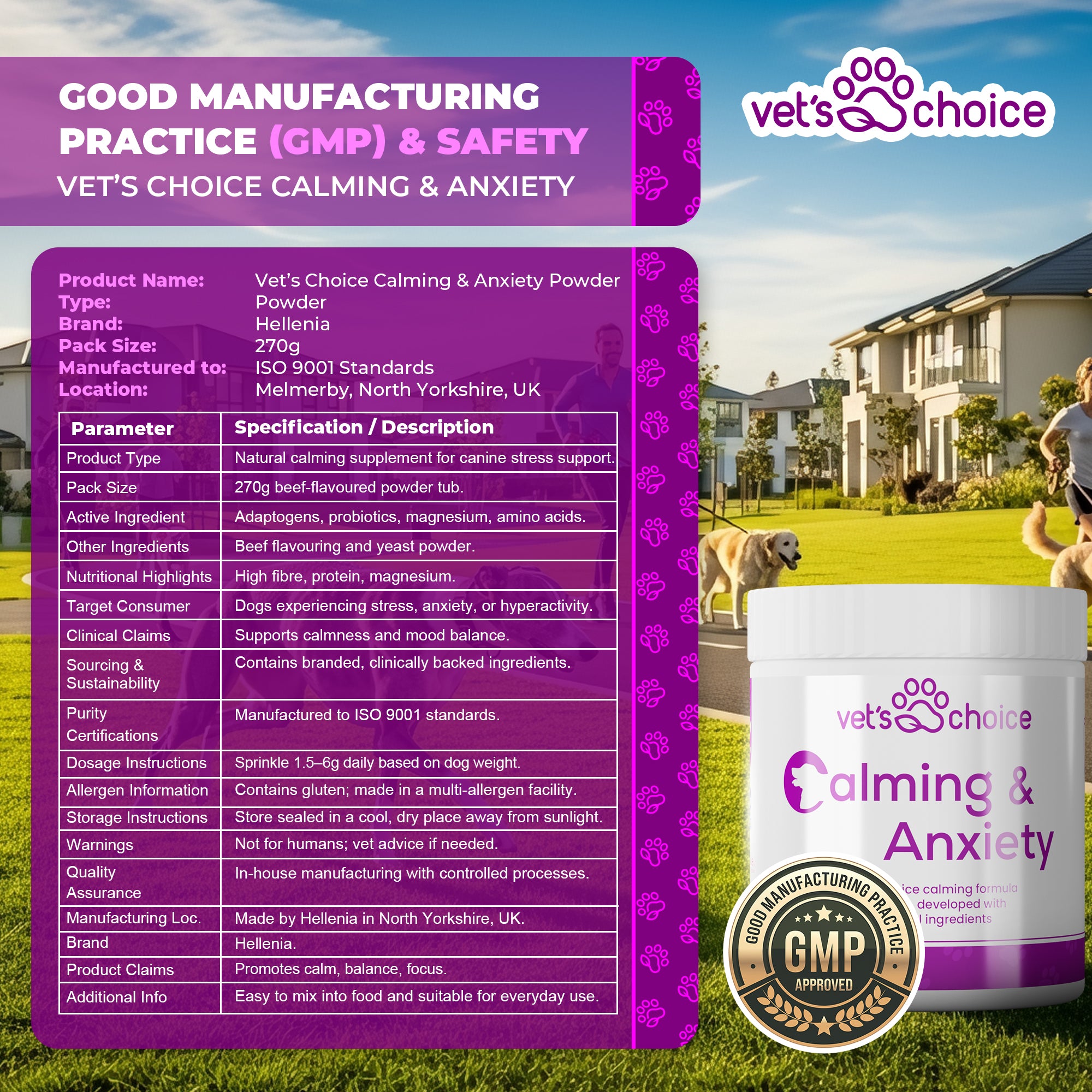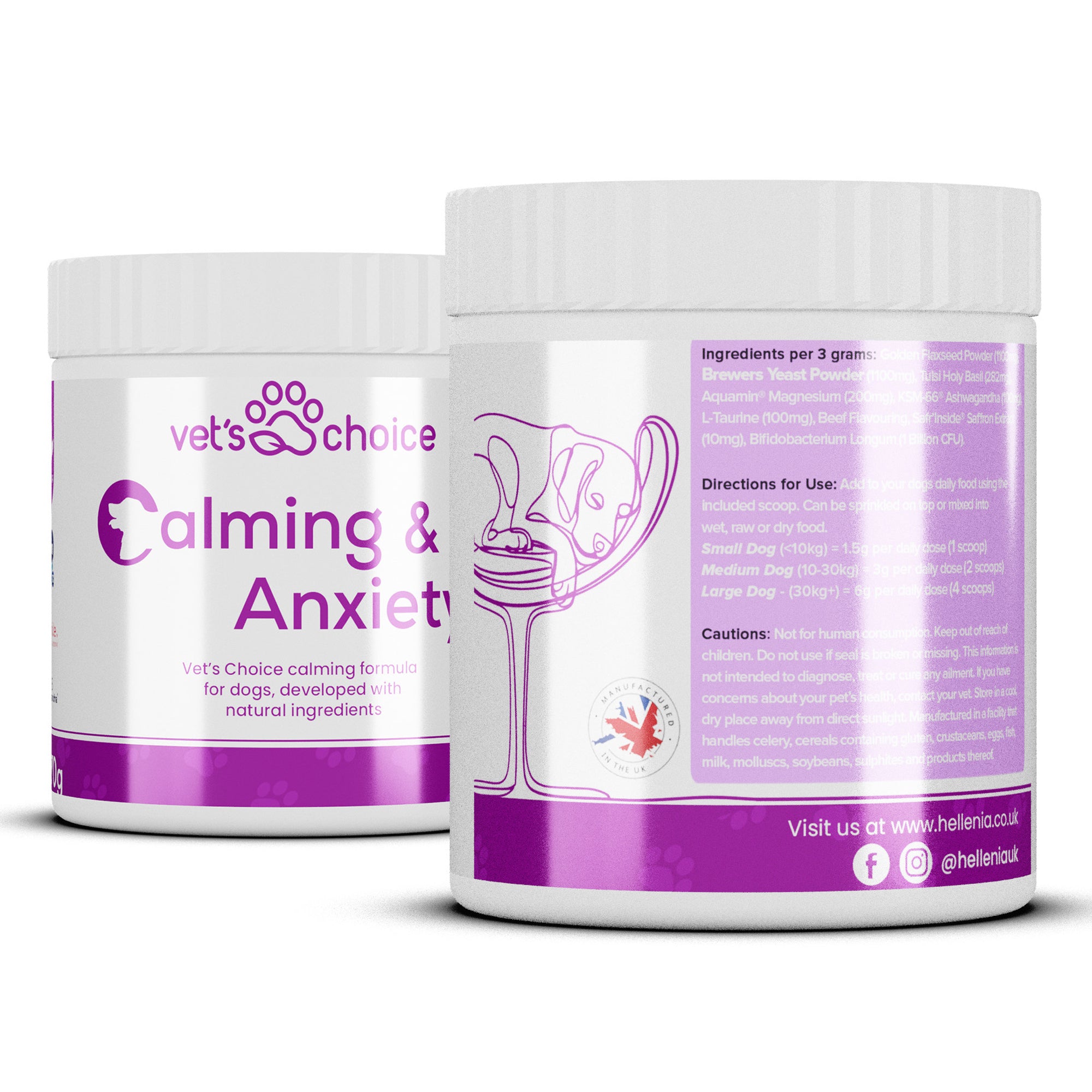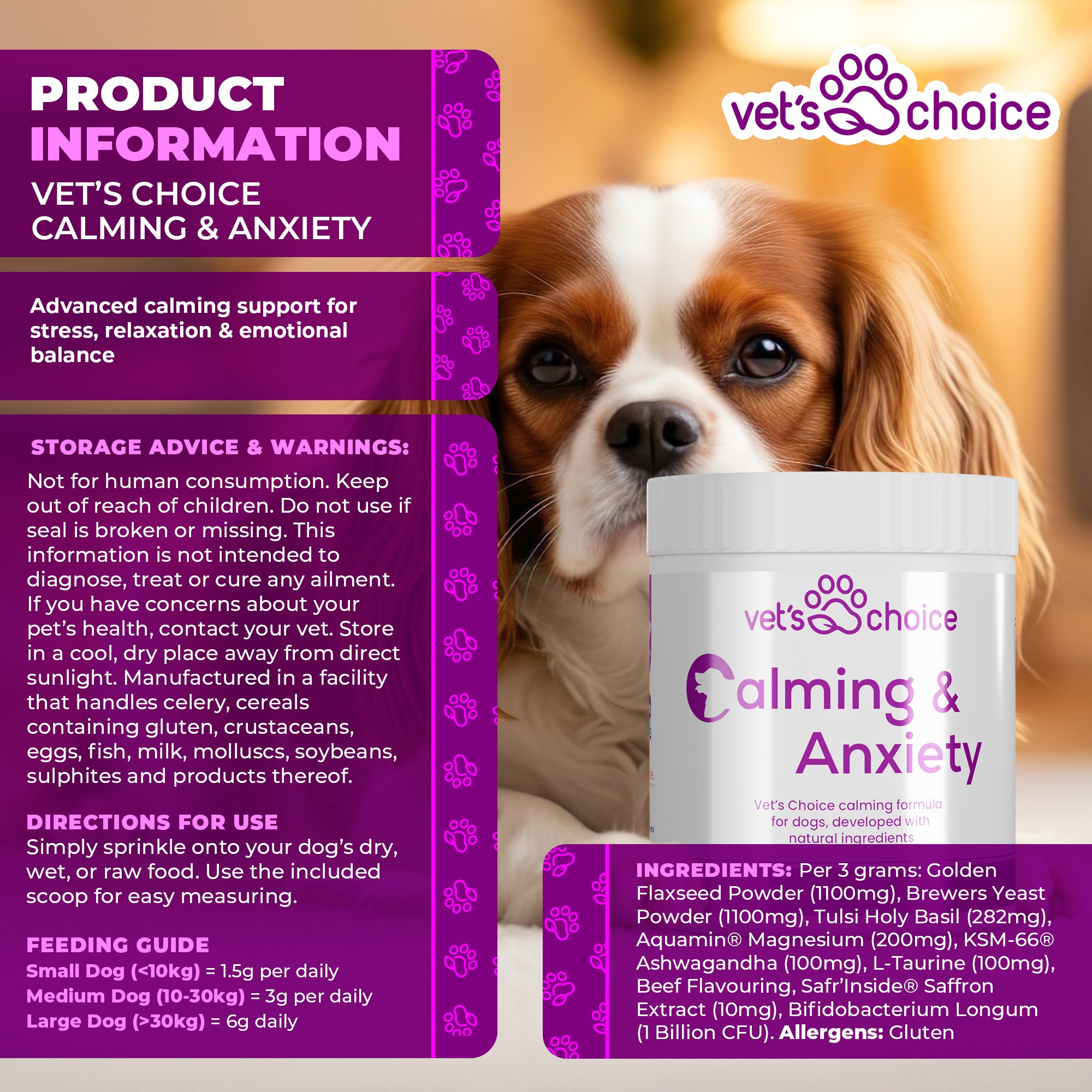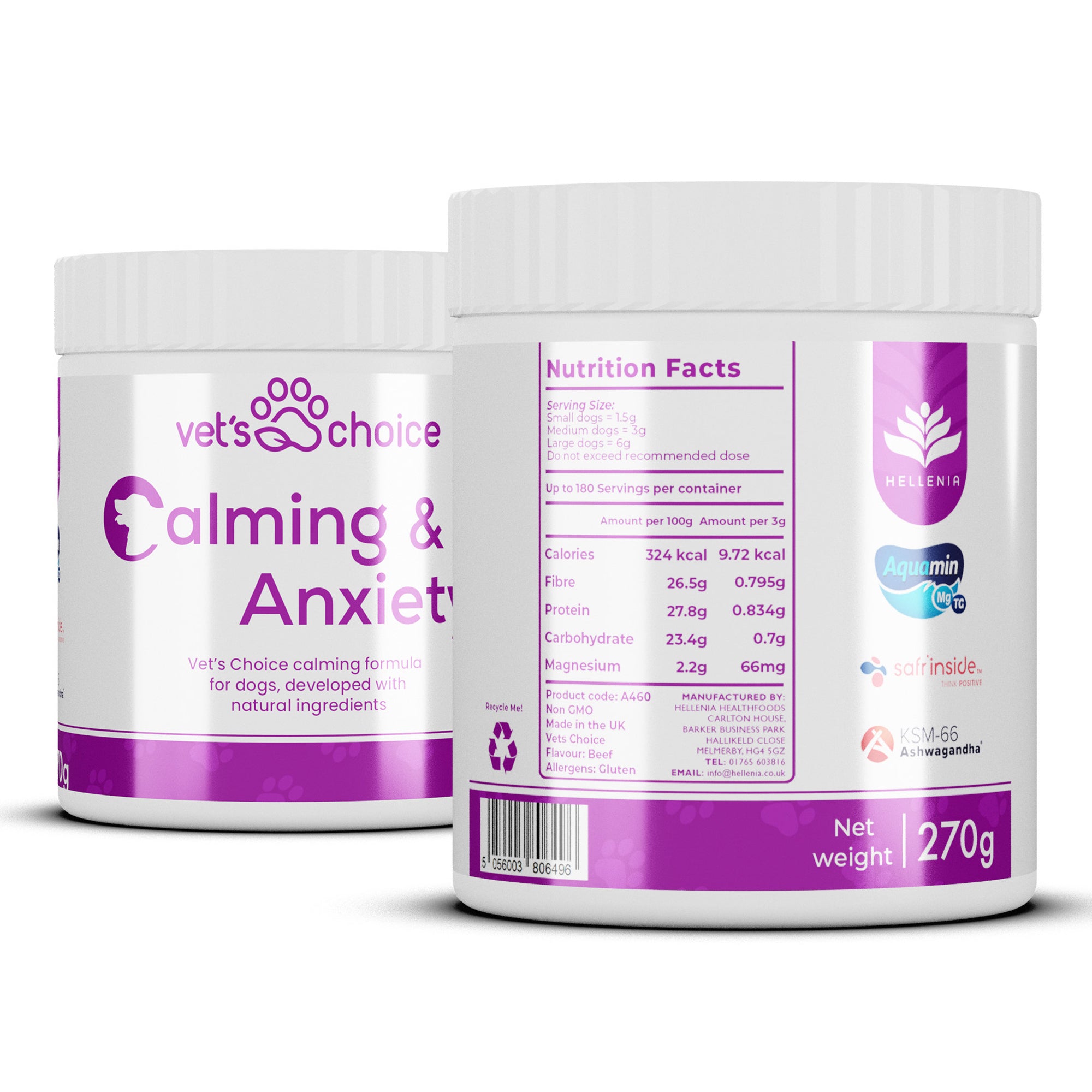 Help your dog stay relaxed, focused, and happy with Vet’s Choice Calming & Anxiety. This premium natural formula combines adaptogenic herbs, amino acids, probiotics, and essential nutrients to promote calm behaviour, balanced mood, and healthy nervous system function, without drowsiness. With a tasty beef flavour, it’s easy to mix into any meal and ideal for daily use or during stressful situations such as travel, separation, or loud noises.