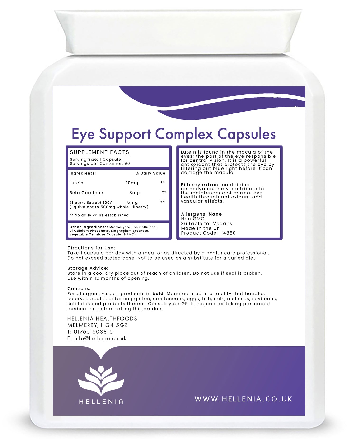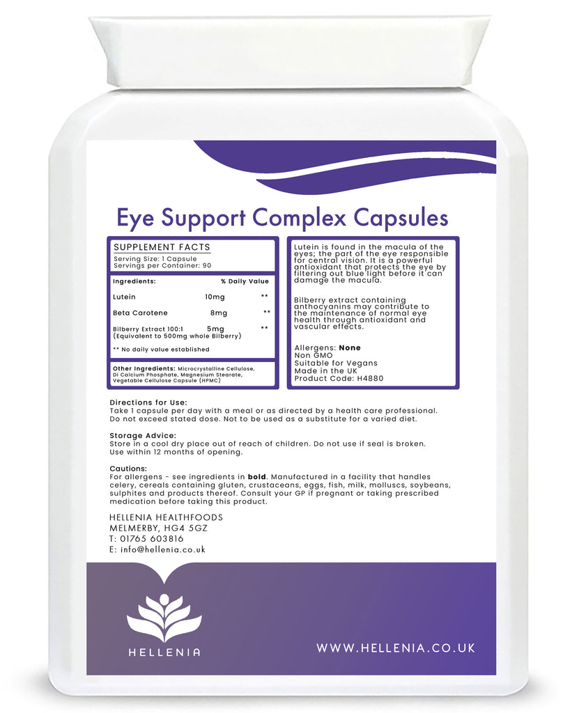 Lutein is found in the macula of the eyes; the part of the eye responsible for central vision. It is a powerful antioxidant that protects the eye by filtering out blue light before it can damage the macula. Lutein is a type of carotenoid that is naturally found in leafy green vegetables where it plays a protective role for the plant, protecting it from excessive sun damage, yet it cannot be manufactured within the body. The Bilberry used is a high quality extract standardised for anthocyanin content. Bilberry extract containing anthocyanins may contribute to the maintenance of normal eye health through antioxidant and vascular effects. The anthocyanins may also contribute to normal blood circulation and the maintenance of normal retina function.