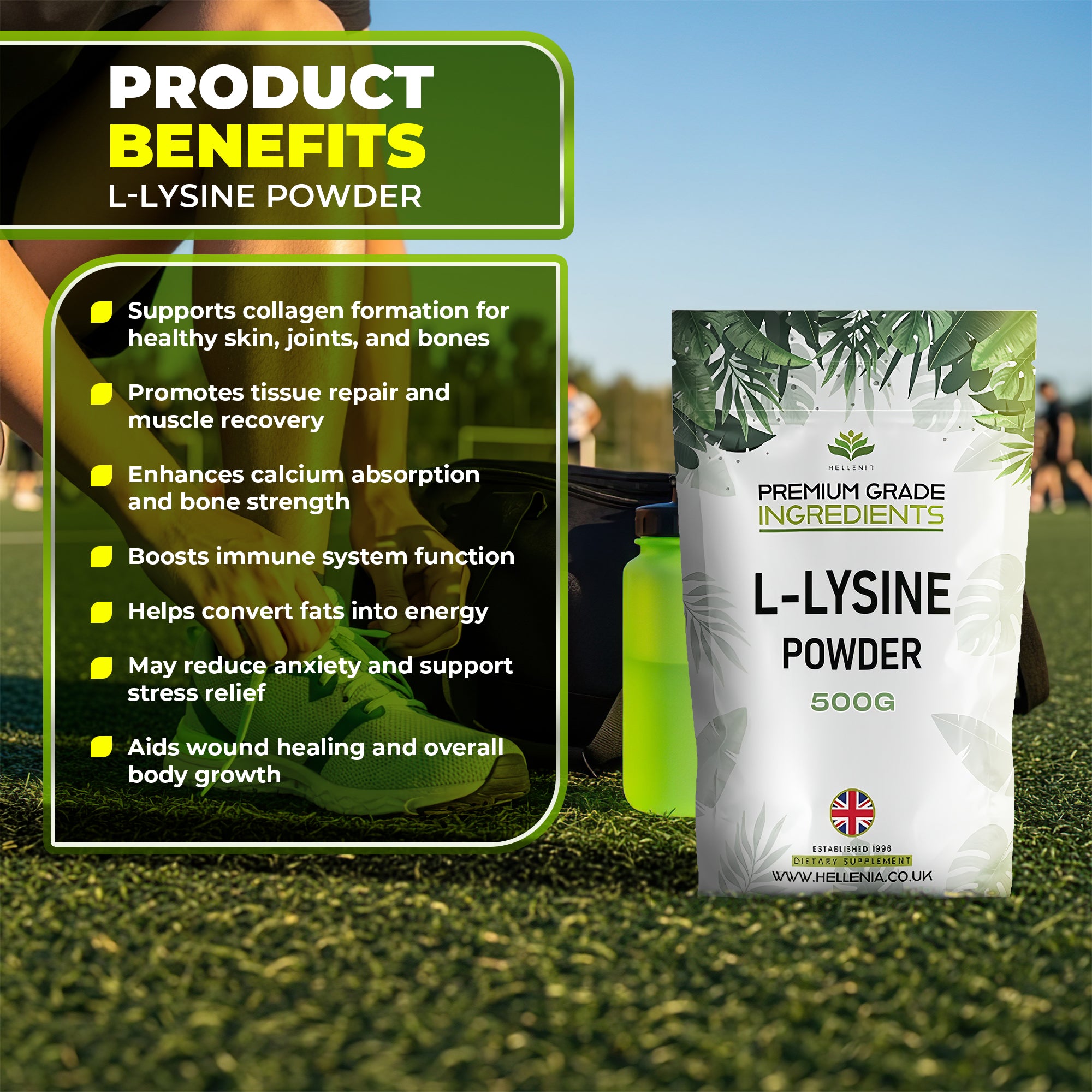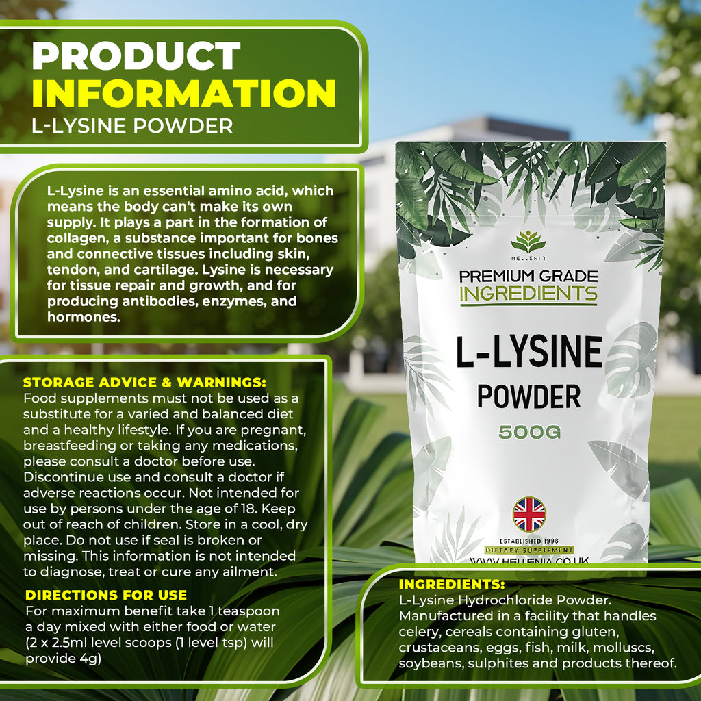 L-Lysine is an essential amino acid, which means the body can't make its own supply. It plays a part in the formation of collagen, a substance important for bones and connective tissues including skin, tendon, and cartilage. Lysine is necessary for tissue repair and growth, and for producing antibodies, enzymes, and hormones.