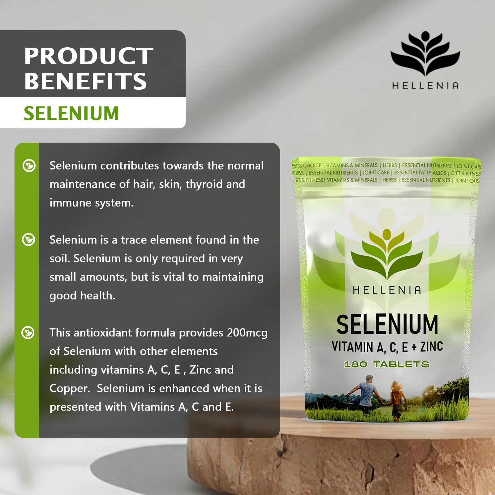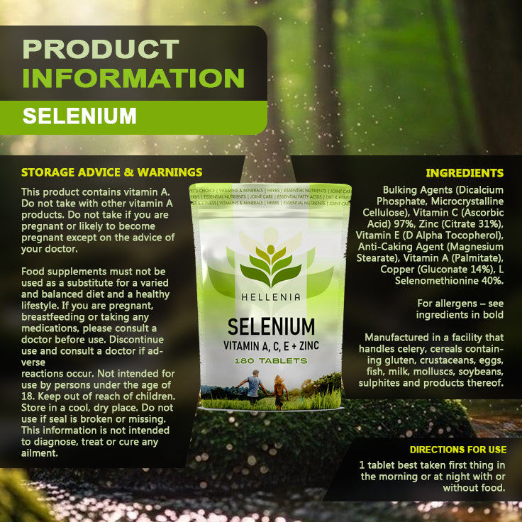 Selenium contributes towards the normal maintenance of hair, skin, thyroid and immune system. Selenium is a trace element found in the soil. Selenium is only required in very small amounts, but is vital to maintaining good health. This antioxidant formula provides 200mcg of Selenium with other elements including vitamins A, C, E , Zinc and Copper. Selenium is enhanced when it is presented with Vitamins A, C and E.