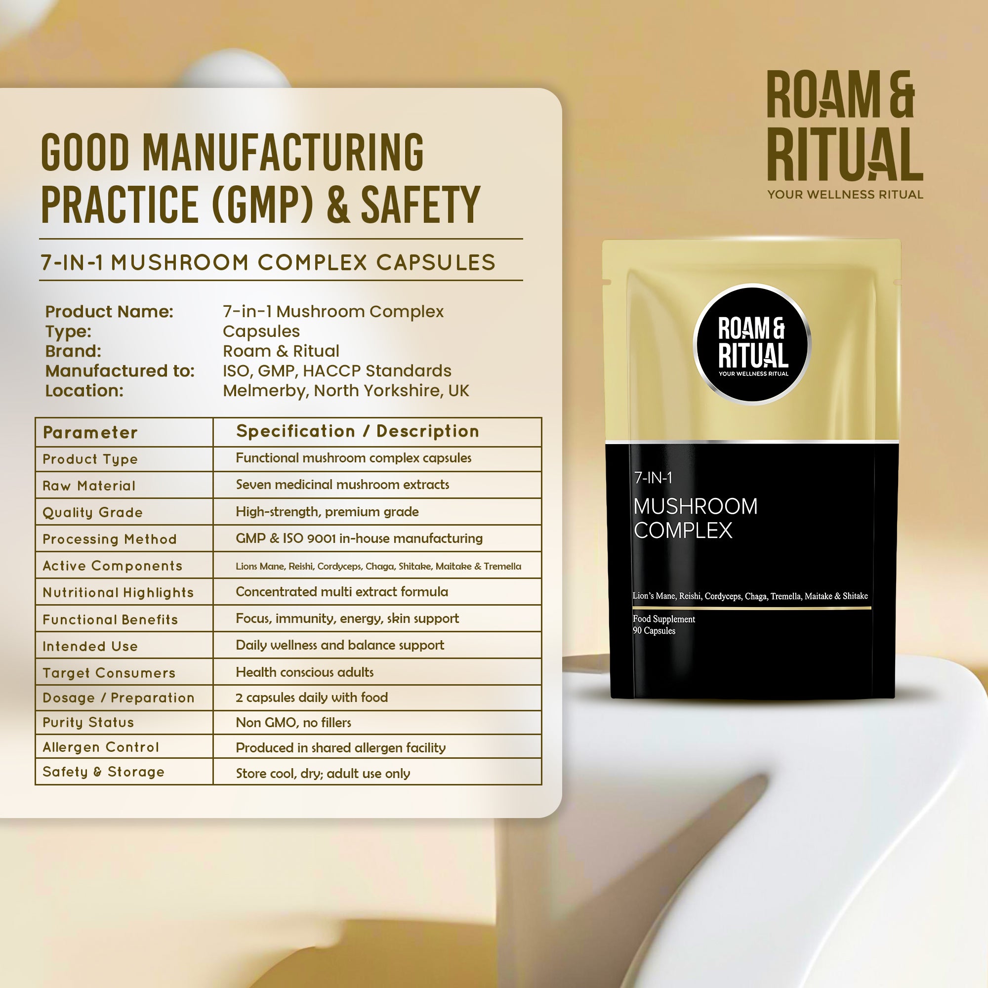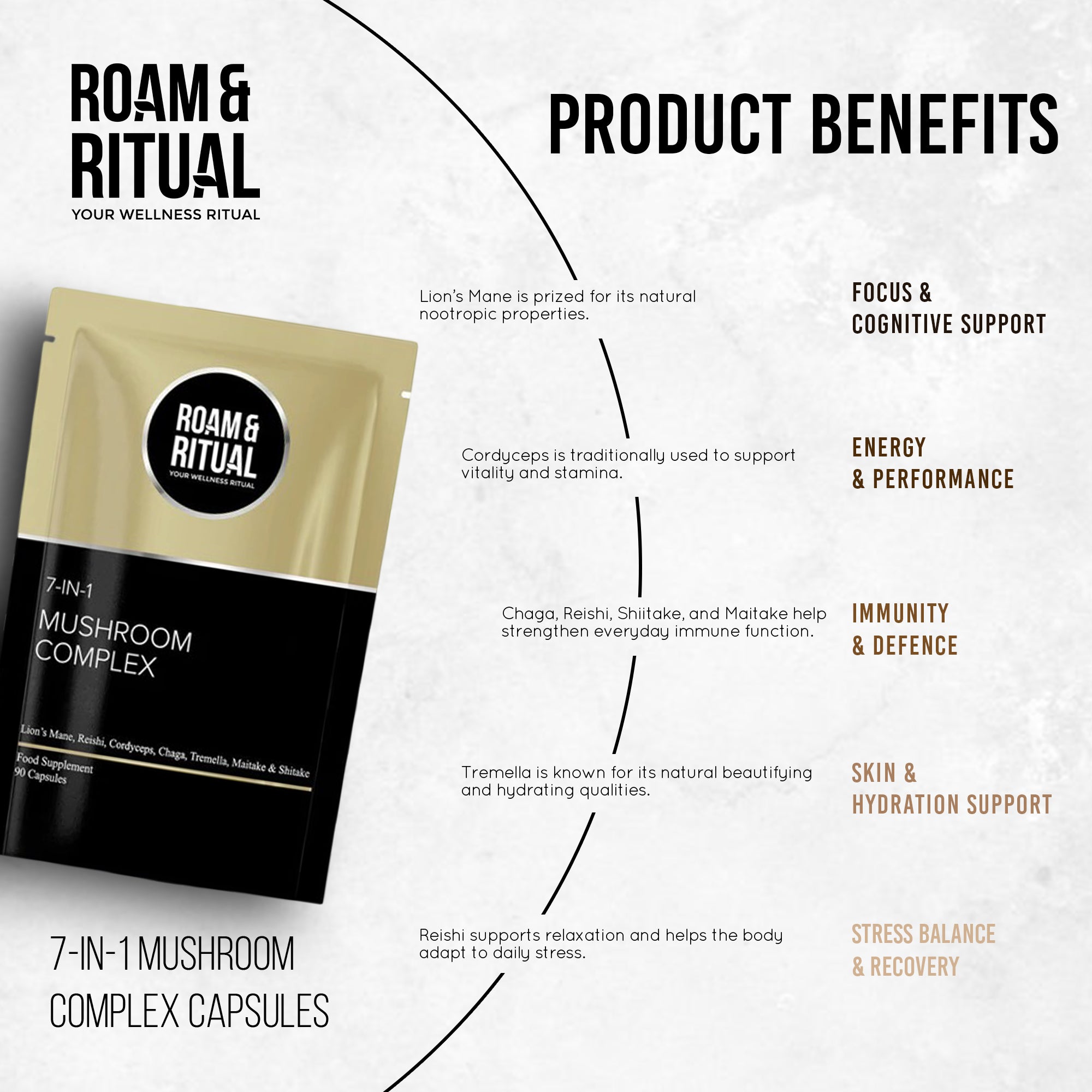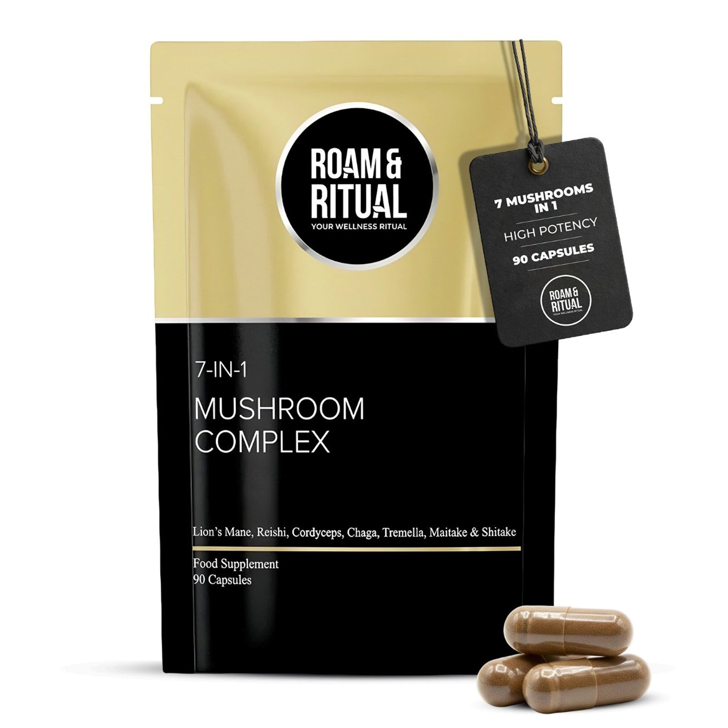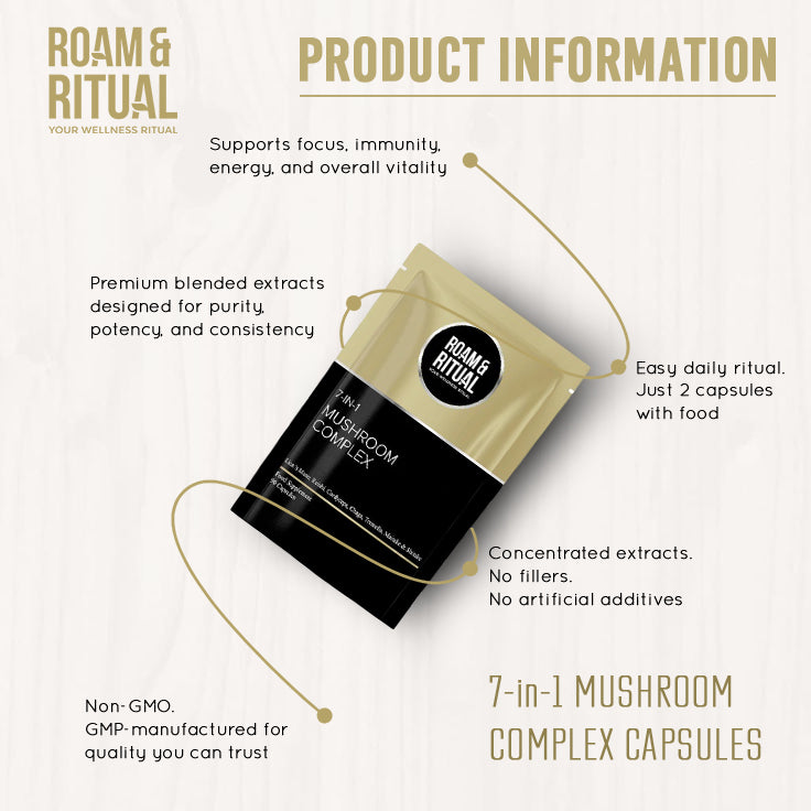 Unlock the power of seven of the world’s most respected functional mushrooms in one high-strength, expertly formulated supplement. Roam & Ritual’s 7-in-1 Mushroom Complex Capsules combine Lion’s Mane, Reishi, Cordyceps, Chaga, Shiitake, Maitake, and Tremella to support your mind, body, and overall wellbeing—naturally.