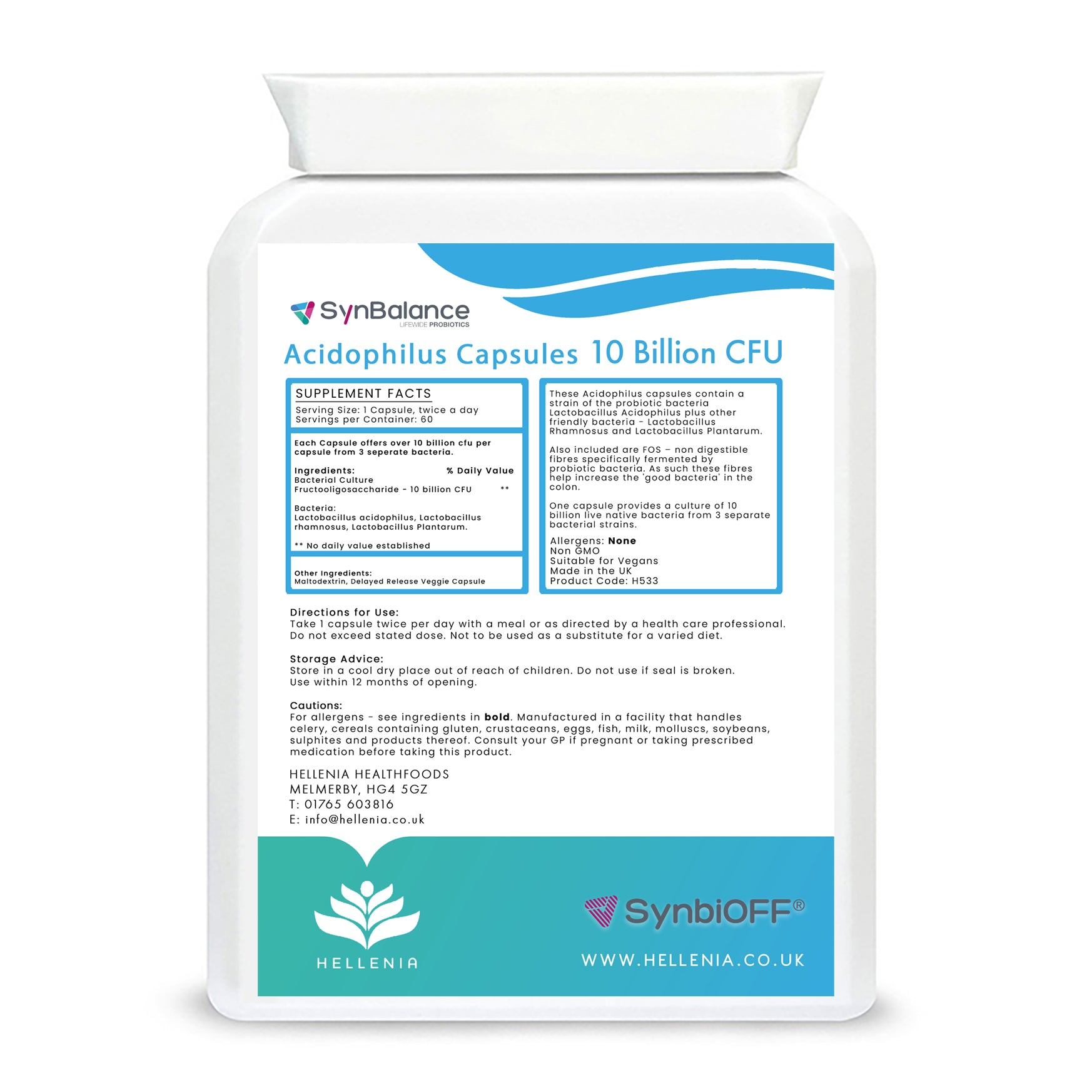 These Acidophilus capsules contain a strain of the probiotic bacteria Lactobacillus Acidophilus plus other friendly bacteria - Lactobacillus Rhamnosus and Lactobacillus Plantarum. Also included are FOS (Fructo-oligosaccarides) – non digestible fibres specifically fermented by probiotic bacteria. As such these fibres help increase the 'good bacteria' in the colon.
